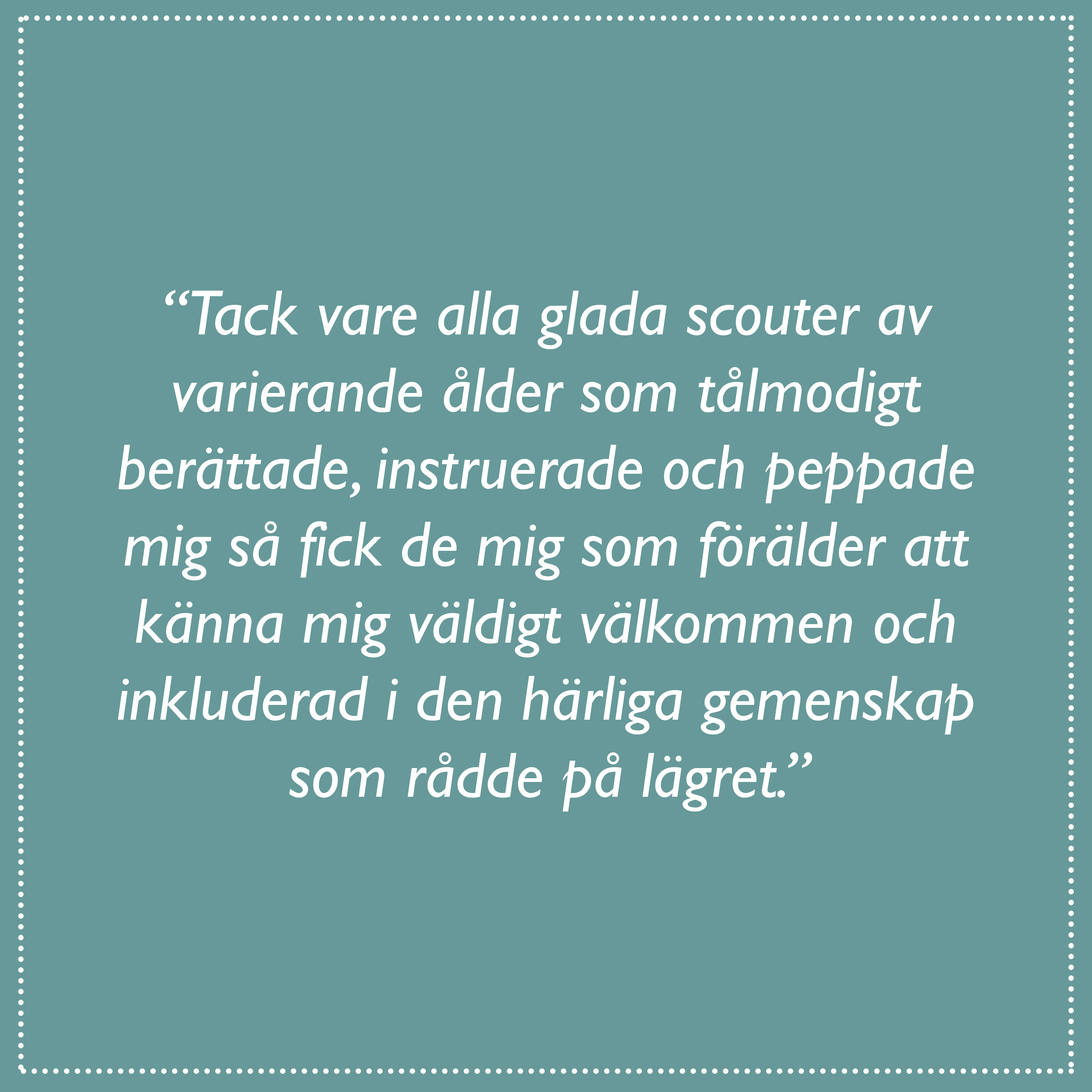 Men tack vare alla glada ledare och scouter av varierande ålder som tålmodigt berättade, instruerade och peppade mig så fick de mig som förälder att känna mig väldigt välkommen och inkluderad i den härliga gemenskap som rådde på lägret. Jag träffade nya människor som alla verkade ha samma värdegrund: att alla är lika viktiga och värda oavsett ålder, kön eller förmåga. Jag fick känna på hur man har fiilis med stil!