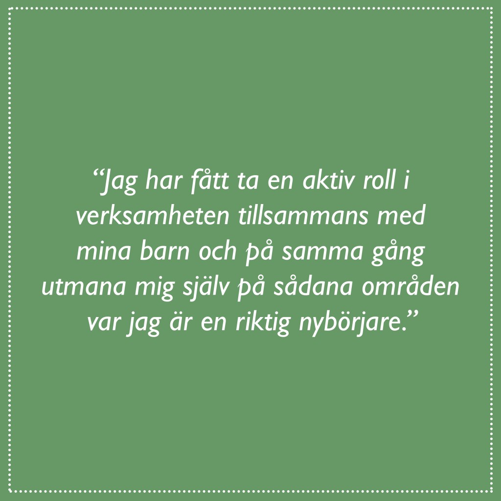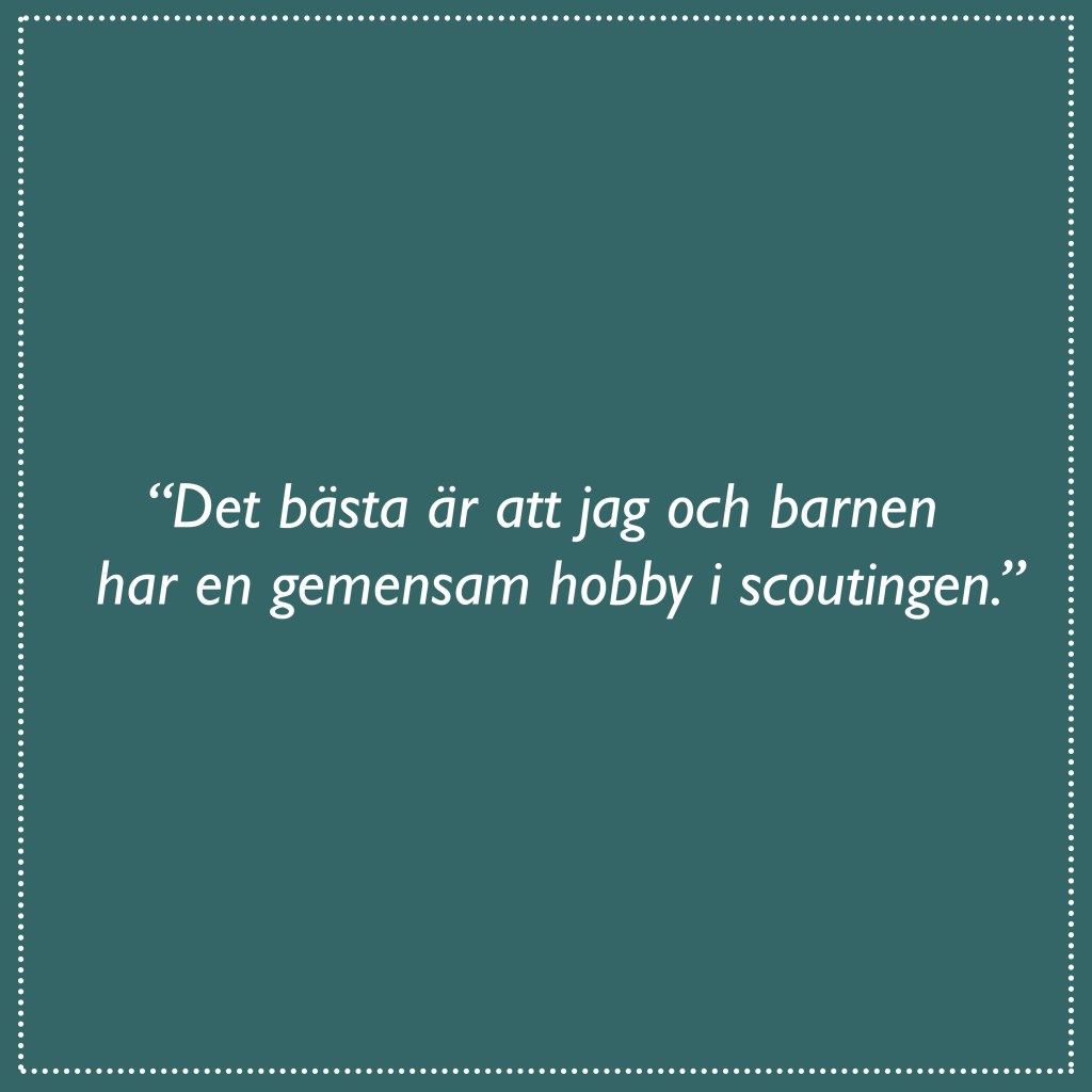 Efter det första lägret blev jag biten och har hängt med på Karis Flickornas evenemang så som bland annat utedag, våravslutning och en förläggning.  Som förälder har jag förutom att delta i evenemangen bl.a. assisterat i lägerköket, fungerat som ”lägermamma” som sökt reda på försvunna strumpor och smörjat olja på de kliande myggbetten, satt ut spårning och gjort upp en lägereld. Jag har fått ta en aktiv roll i en verksamhet tillsammans med mina barn och på samma gång utmana mig själv på sådana områden var jag är en riktig nybörjare. Det bästa är att jag och barnen har en gemensam hobby i scoutingen.